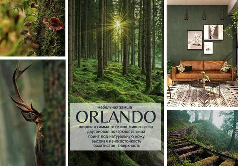 Коллекция мебельной замши Orlando – именно такой материал. Цветовая карта Orlando включает оттенки таинственного леса, влажной коры, застывшей смолы, речной гальки, хвои и лесных ягод. При этом, как и натуральная замша коллекция Orlando является двутоновой.